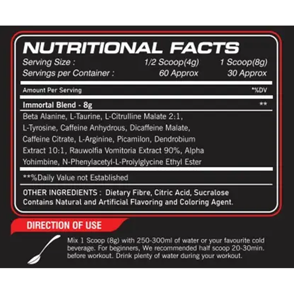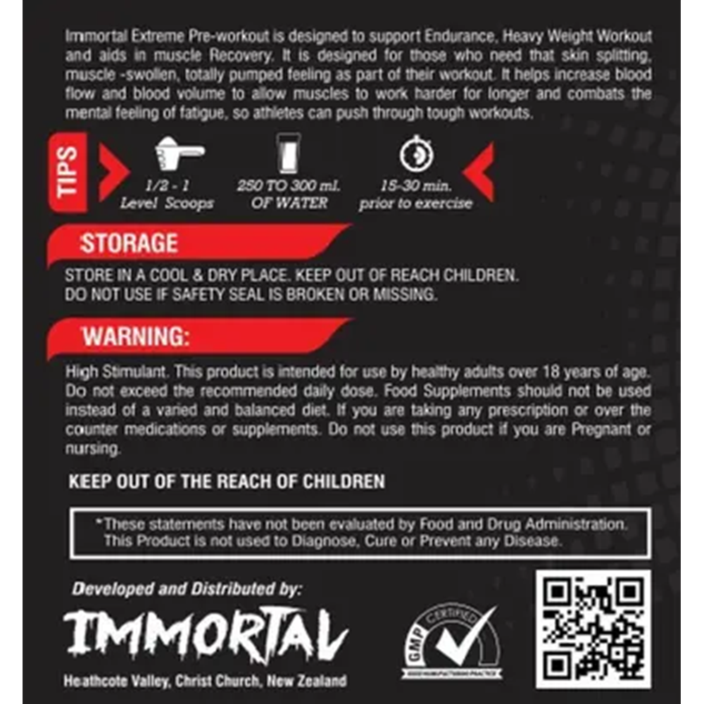 - Immortal Extreme Preworkout helps increase blood flow and blood volume to allow muscles to work harder for longer and combats the mental feeling of fatigue, so athletes can push through tough workouts.